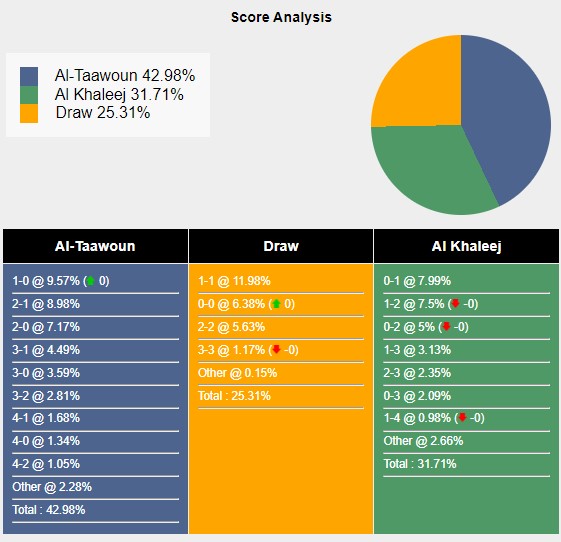 Với các tỷ số có khả năng xảy ra, câu lạc bộ Al Taawoun thắng lợi 1-0 đạt 9,57%. Hai đội hoà nhau với tỷ số 1-1 đạt 11,98%. Al Khaleej sở hữu 7,99% khả năng đánh bại Al Taawoun 1-0.