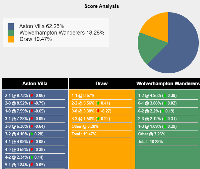 Tỷ số khả dĩ nhất cho chiến thắng của Aston Villa là 2-1 với xác suất là 9,73%. Tỷ số khả dĩ thứ hai cho kết quả đó là 2-0 (8,52%) và 1-0 (7,59%). Tỷ số khả dĩ nhất là 1-1 (8,67%), trong khi tỷ số khả dĩ nhất cho chiến thắng của Wolverhampton Wanderers là 1-2 (4,95%).