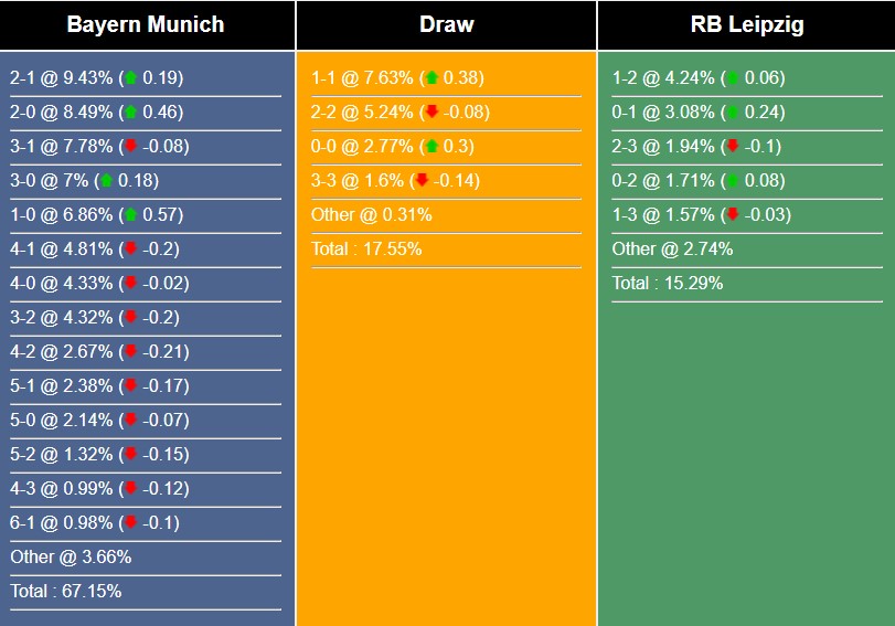 Câu lạc bộ Bayern Munich đang có nhiều lợi thế để có được chiến thắng ở trận đấu này. Tuy nhiên, vì phong độ không tốt nên khả năng cao nhất đội bóng này thắng là 2-1 với tỷ lệ 9.43% . Xếp sau đó là xác suất “hùm xám” thắng với tỷ số 2-0 là 8.49% . Về phía đội khách Leipzig thì khả năng họ thắng 2-1 chỉ là 4.24%. Còn khả năng 2 đội hòa 1-1 là 7.63% .