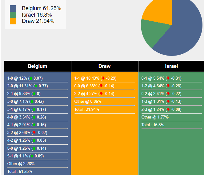 Tỷ số khả dĩ nhất cho chiến thắng của Bỉ là 1-0 với xác suất là 12%. Tỷ số khả dĩ thứ hai cho kết quả đó là 2-0 (11,31%) và 2-1 (9,83%). Tỷ số khả dĩ nhất là 1-1 (10,43%), trong khi tỷ số khả dĩ nhất cho chiến thắng của Israel là 0-1 (5,54%).