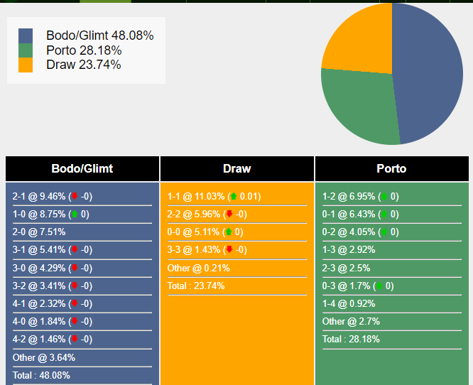 Tỷ số khả dĩ nhất cho chiến thắng của Bodo/Glimt là 2-1 với xác suất là 9,46%.Tỷ số khả dĩ thứ hai cho kết quả đó là 1-0 (8,75%) và 2-0 (7,51%).Chiến thắng khả dĩ nhất của Porto là 1-2 (6,95%), trong khi tỷ số hòa là 1-1 (11,03%).