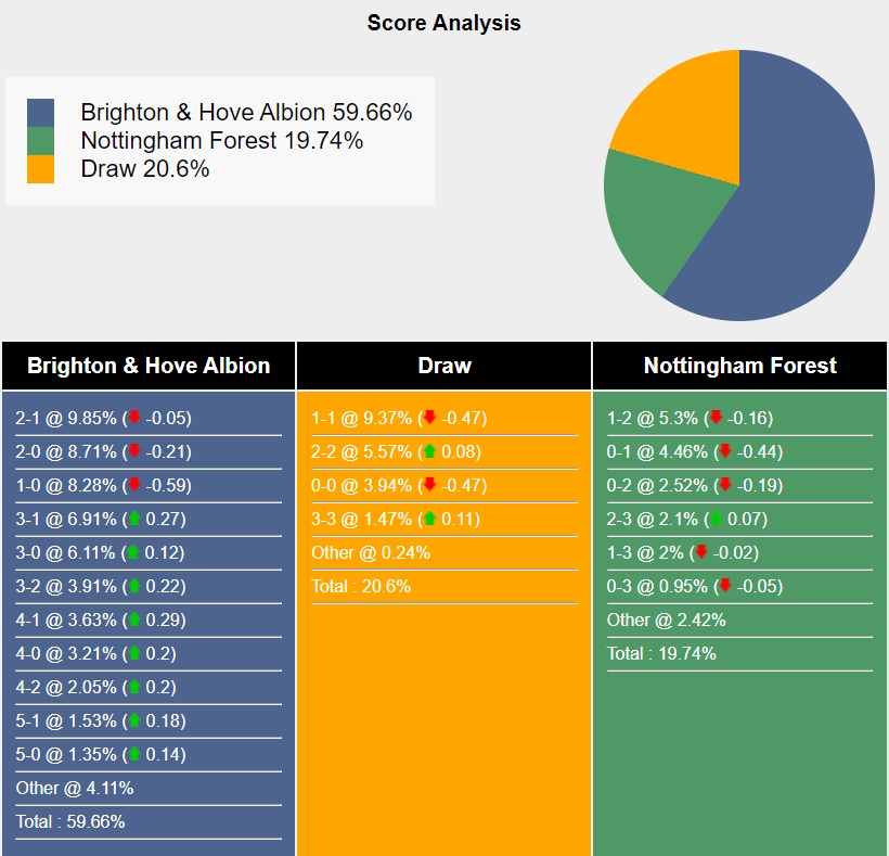 Tỷ số khả dĩ nhất cho chiến thắng của Brighton & Hove Albion là 2-1 với xác suất là 9,85%. Tỷ số khả dĩ thứ hai cho kết quả đó là 2-0 (8,71%) và 1-0 (8,28%). Tỷ số khả dĩ nhất là 1-1 (9,37%), trong khi tỷ số khả dĩ nhất cho chiến thắng của Nottingham Forest là 1-2 (5,3%).