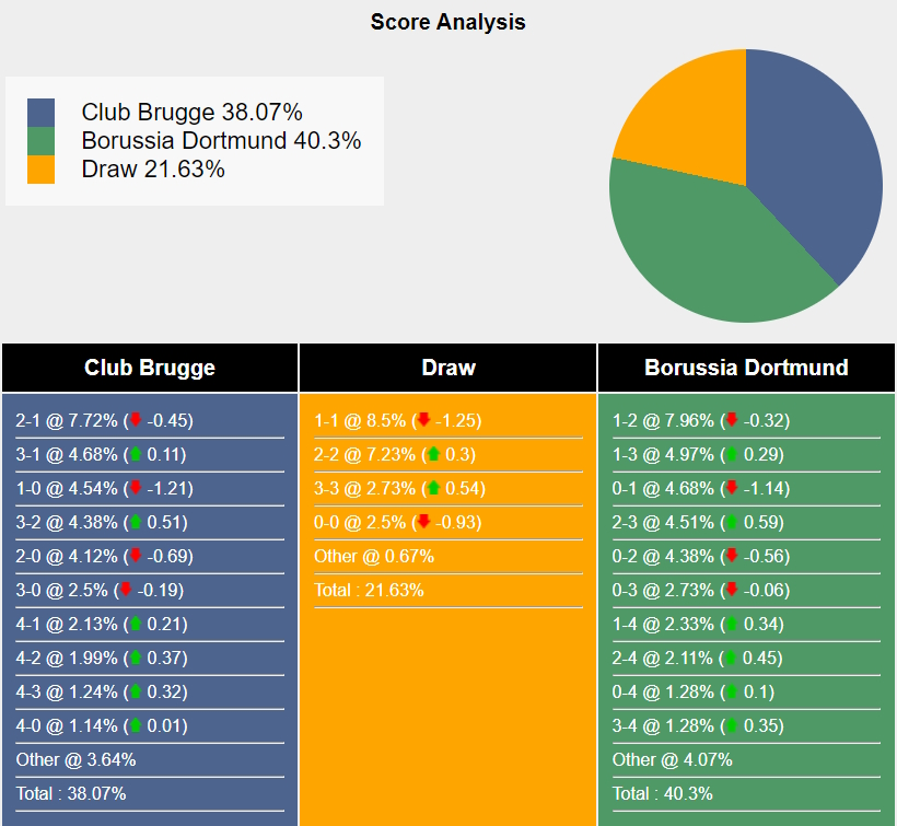 Tỷ số khả dĩ nhất cho chiến thắng của Borussia Dortmund là 1-2 với xác suất là 7,96%. Tỷ số khả dĩ thứ hai cho kết quả đó là 1-3 (4,97%) và 0-1 (4,68%). Chiến thắng khả dĩ nhất của Club Brugge là 2-1 (7,72%), trong khi tỷ số hòa là 1-1 (8,5%).