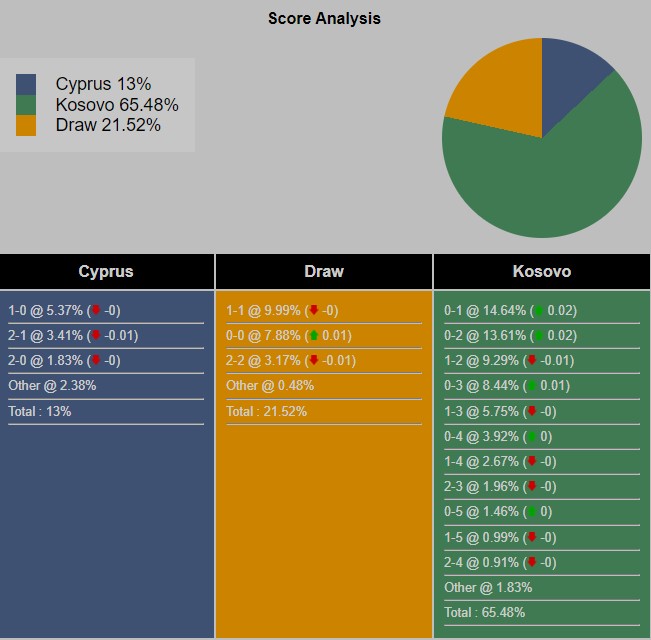 Với các tỷ số có khả năng xảy ra, câu lạc bộ Đảo Síp thắng lợi 1-0 đạt 5,37%. Hai đội hoà nhau với tỷ số 1-1 đạt 9,99%.Kosovo sở hữu 14,64% khả năng đánh bại Đảo Síp 1-0.