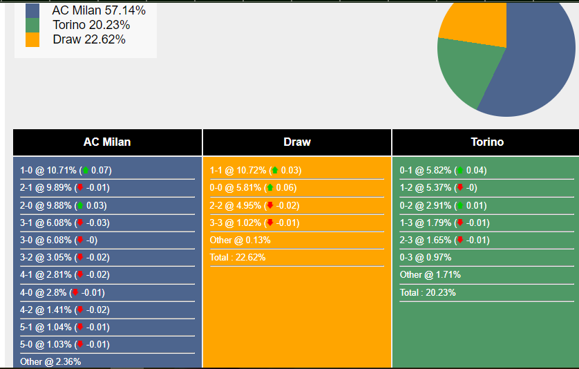 Tỷ số khả dĩ nhất cho chiến thắng của AC Milan là 1-0 với xác suất là 10,71%. Tỷ số khả dĩ thứ hai cho kết quả đó là 2-1 (9,89%) và 2-0 (9,88%).Tỷ số khả dĩ nhất là 1-1 (10,72%), trong khi tỷ số khả dĩ nhất cho chiến thắng của Torino là 0-1 (5,82%).