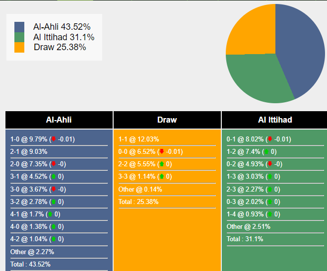 Tỉ số có khả năng xảy ra nhất để Al-Ahli thắng là 1-0 với xác suất 9,79%. Tỷ số có khả năng xảy ra tiếp theo cho kết quả đó là 2-1 (9,03%) và 2-0 (7,35%). Tỷ số có khả năng thắng nhất của Al Ittihad là 0-1 (8,02%), trong khi tỷ số hòa là 1-1 (12,03%).