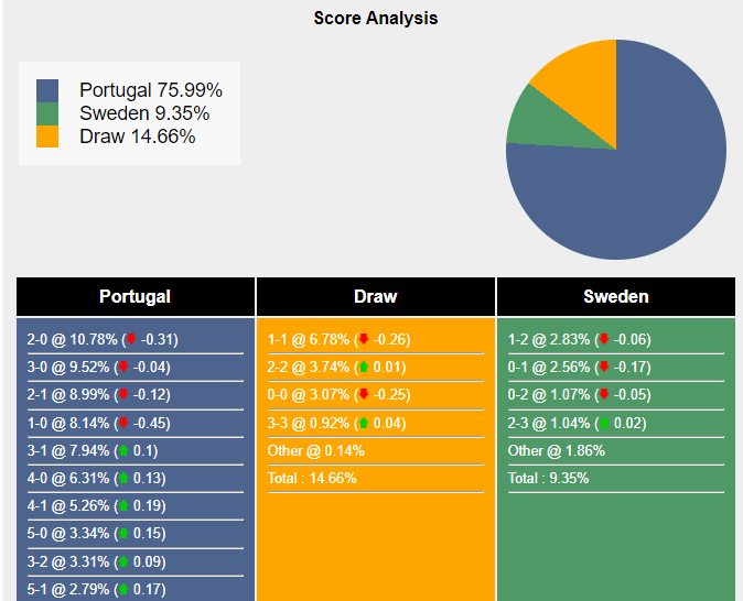 Tỉ số có khả năng xảy ra nhất cho chiến thắng của Bồ Đào Nha là 2-0 với xác suất 10,78%. Tỷ số có khả năng xảy ra tiếp theo cho kết quả đó là 3-0 (9,52%) và 2-1 (8,99%). Tỷ số hòa có khả năng xảy ra cao nhất là 1-1 (6,78%), trong khi Thụy Điển thắng là 1-2 (2,83%).