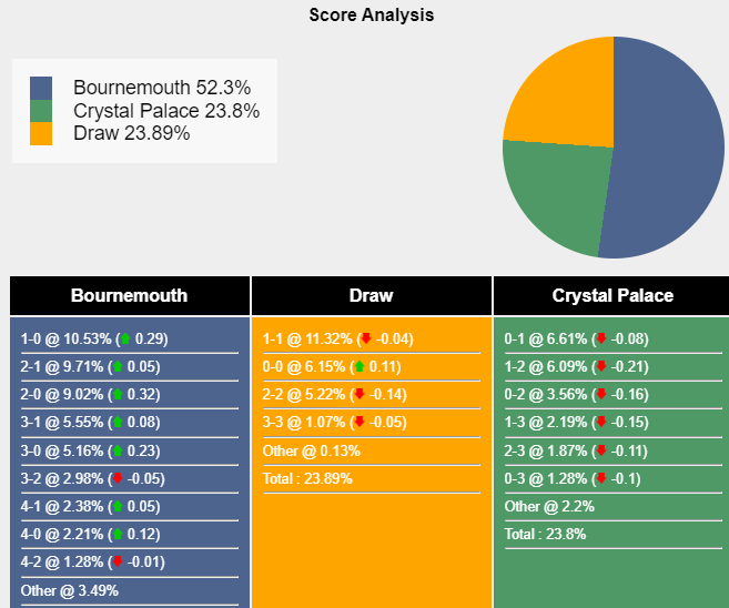 Tỉ số khả dĩ nhất để Bournemouth thắng là 1-0 với xác suất 10,53%. Tỷ số có khả năng xảy ra tiếp theo cho kết quả đó là 2-1 (9,71%) và 2-0 (9,02%). Tỷ số hòa có khả năng xảy ra cao nhất là 1-1 (11,32%), trong khi Crystal Palace thắng là 0-1 (6,61%).