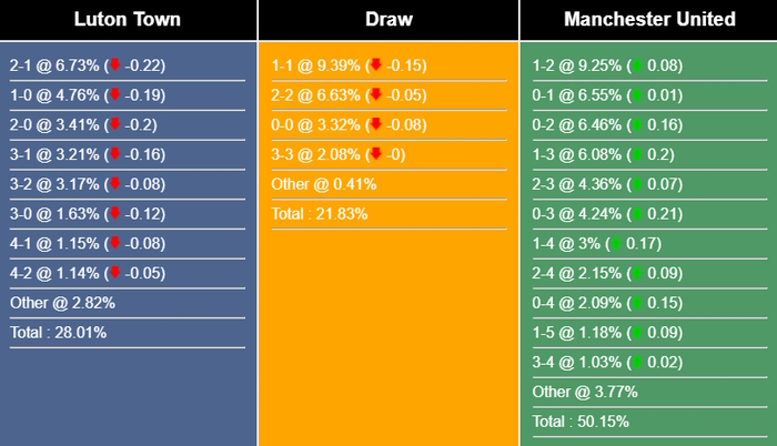 Tỷ số có khả năng xảy ra nhất để Manchester United giành chiến thắng là 1-2 với xác suất 9,25%. Tỷ số có khả năng xảy ra tiếp theo cho kết quả đó là 0-1 (6,55%) và 0-2 (6,46%). Tỷ số dễ nhất mà Luton Town giành được là 2-1 (6,73%), trong khi tỷ số hòa là 1-1 (9,39%).