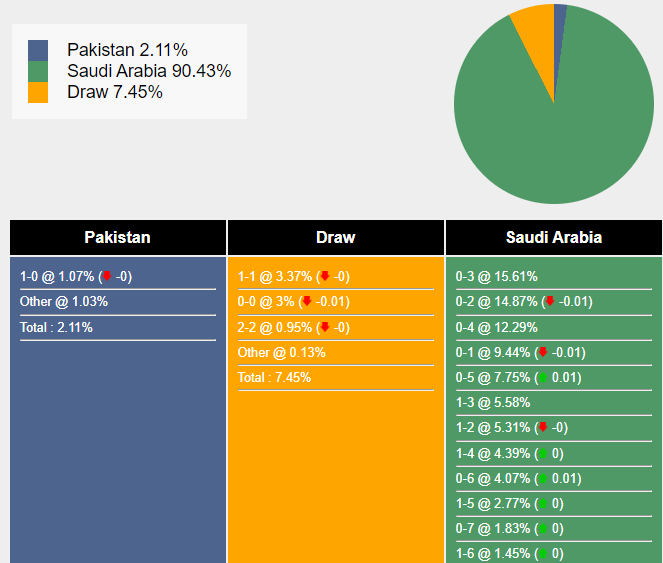 Tỉ số khả dĩ nhất để Ả Rập Xê Út thắng là 0-3 với xác suất 15,61%. Tỷ số có khả năng xảy ra tiếp theo cho kết quả đó là 0-2 (14,87%) và 0-4 (12,29%). Tỷ số hòa có khả năng xảy ra cao nhất là 1-1 (3,37%), trong khi tỷ số cho Pakistan thắng là 1-0 (1,07%).