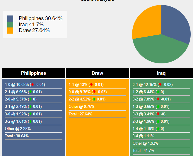 Tỉ số có khả năng xảy ra nhất cho chiến thắng của Iraq là 0-1 với xác suất 12,15%. Tỷ số có khả năng xảy ra tiếp theo cho kết quả đó là 1-2 (8,44%) và 0-2 (7,89%). Tỷ số có khả năng thắng cao nhất của Philippines là 1-0 (10,02%), trong khi tỷ số hòa là 1-1 (13%).