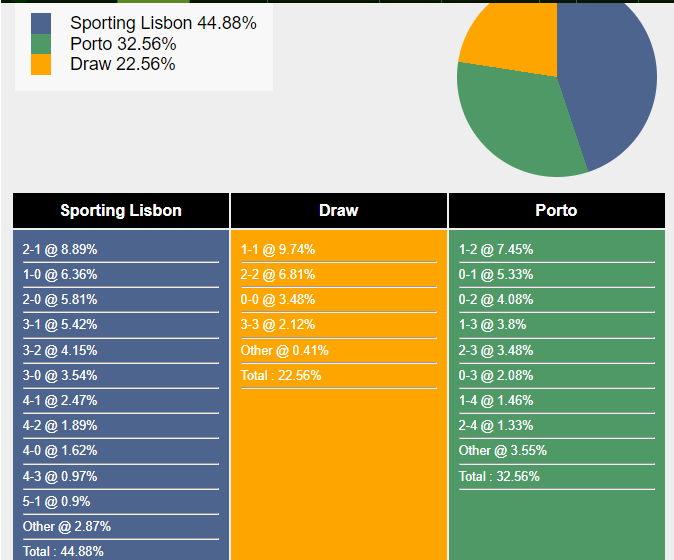 Tỷ số khả dĩ nhất cho chiến thắng của Sporting Lisbon là 2-1 với xác suất là 8,89%. Tỷ số khả dĩ thứ hai cho kết quả đó là 1-0 (6,36%) và 2-0 (5,81%). Chiến thắng khả dĩ nhất của Porto là 1-2 (7,45%), trong khi tỷ số hòa là 1-1 (9,74%).