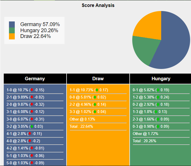 Tỷ số khả dĩ nhất cho chiến thắng của Đức là 1-0 với xác suất là 10,7%. Tỷ số khả dĩ thứ hai cho kết quả đó là 2-1 (9,89%) và 2-0 (9,87%) . Tỷ số khả dĩ nhất là 1-1 (10,73%), trong khi tỷ số khả dĩ nhất cho chiến thắng của Hungary là 0-1 (5,82%).