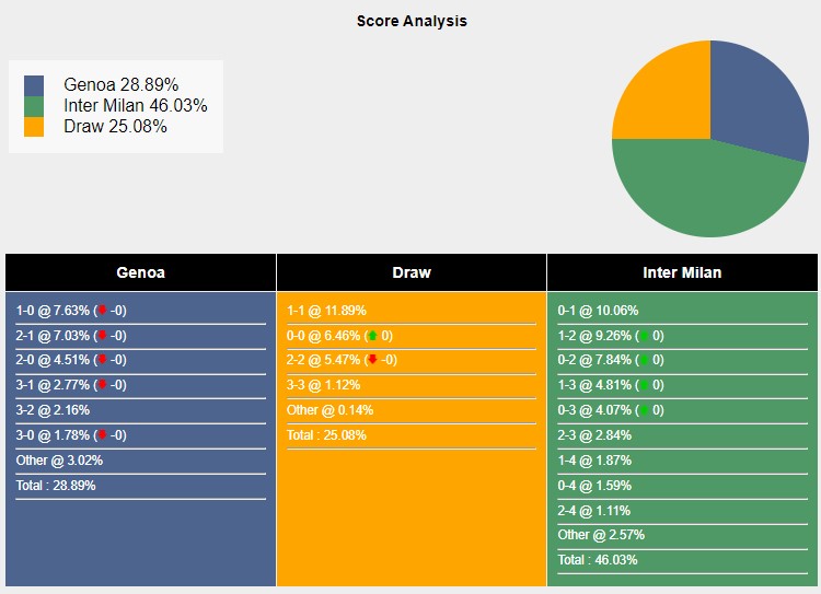 Với các tỷ số có khả năng xảy ra, câu lạc bộ Genoa thắng lợi 1-0 đạt 7,63%. Hai đội hoà nhau với tỷ số 1-1 đạt 11,89%. Inter Milan sở hữu 10,06% khả năng đánh bại Genoa 1-0.