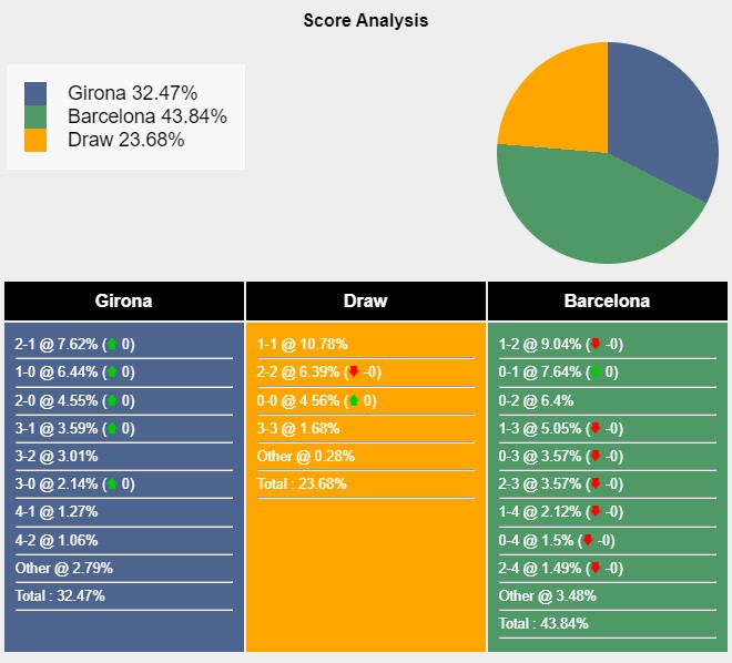 Với các tỷ số có khả năng xảy ra, câu lạc bộ Girona thắng lợi 2-1 đạt 7,62%. Hai đội hoà nhau với tỷ số 1-1 đạt 10,78%.Barcelona sở hữu 9,04% khả năng đánh bại Girona 2-1.
