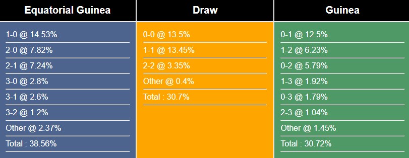 Với các tỷ số có khả năng xảy ra, việc Guinea Xích Đạo thắng lợi 1-0 đạt 14,53%. Tiếp theo là những chiến thắng 2-1 (7,82%) và 2-0 (7,24%). Khả năng 90 phút tới hai đội chia điểm khi hòa nhau 0-0 đạt 13,5%. Cuối cùng là việc Guinea đánh bại Guinea Xích Đạo 1-0 là 12,5%.