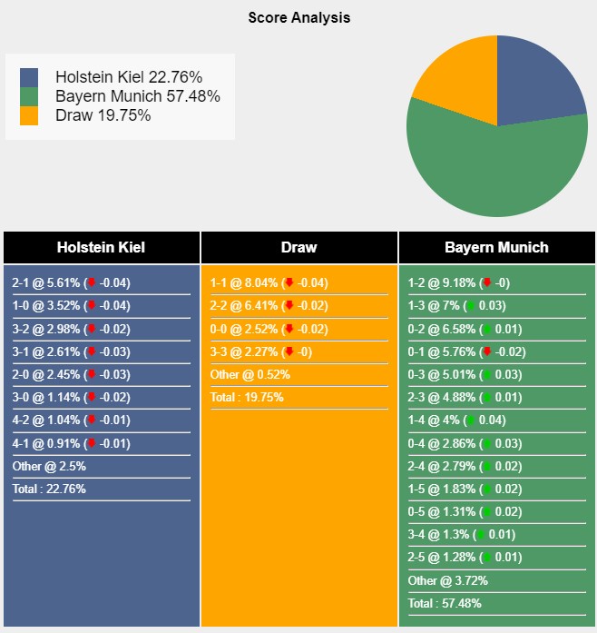Với các tỷ số có khả năng xảy ra, câu lạc bộ Holstein Kiel thắng lợi 2-1 đạt 5,61%.Hai đội hoà nhau với tỷ số 1-1 đạt 8,04%.Bayern Munich sở hữu 9,18% khả năng đánh bại Holstein Kiel 2-1.