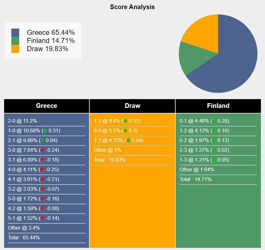 Tỷ số khả dĩ nhất cho chiến thắng của Hy Lạp là 2-0 với xác suất là 11,2%. Tỷ số khả dĩ thứ hai cho kết quả đó là 1-0 (10,68%) và 2-1 (9,86%). Tỷ số khả dĩ nhất là 1-1 (9,4%), trong khi tỷ số khả dĩ nhất cho chiến thắng của Phần Lan là 0-1 (4,48%).