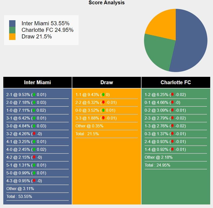 Tỷ số khả dĩ nhất cho chiến thắng của Inter Miami là 2-1 với xác suất là 9,53%. Tỷ số khả dĩ thứ hai cho kết quả đó là 2-0 (7,18%) và 1-0 (7,11%).Chiến thắng khả dĩ nhất của Charlotte FC là 1-2 (6,25%), trong khi tỷ số hòa là 1-1 (9,43%).
