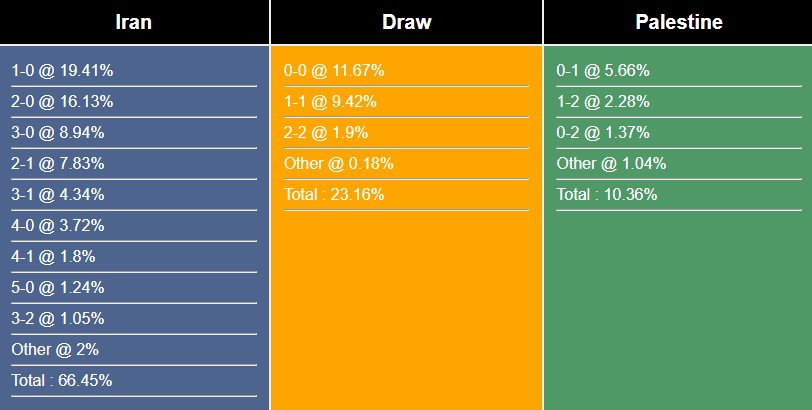 Với các tỷ số có khả năng xảy ra, việc Iran thắng lợi 2-0 đạt 16,12%. Tiếp theo là chiến thắng 1-0 (19,43%) nghiêng về Iran và 3-0 (8,92%). Khả năng trận ra quân hai đội cầm hòa nhau 1-1 đạt 9,43%. Cuối cùng là việc Palestine đánh bại Iran 1-0 là 5,68%.