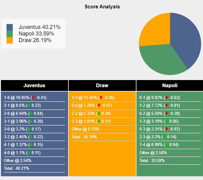 Với các tỷ số có khả năng xảy ra, câu lạc bộ Juventus thắng lợi 1-0 đạt 10,05%. Hai đội hoà nhau với tỷ số 1-1 đạt 12,45%.Napoli sở hữu 9,02% khả năng đánh bại Juventus 1-0.