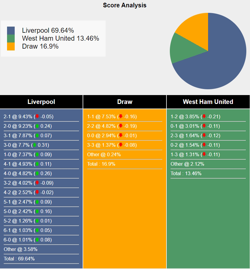 Tỷ số khả dĩ nhất cho chiến thắng của Liverpool là 2-1 với xác suất là 9,43%. Tỷ số khả dĩ thứ hai cho kết quả đó là 2-0 (9,23%) và 3-1 (7,87%). Tỷ số khả dĩ nhất là 1-1 (7,53%), trong khi tỷ số khả dĩ nhất cho chiến thắng của West Ham United là 1-2 (3,85%).