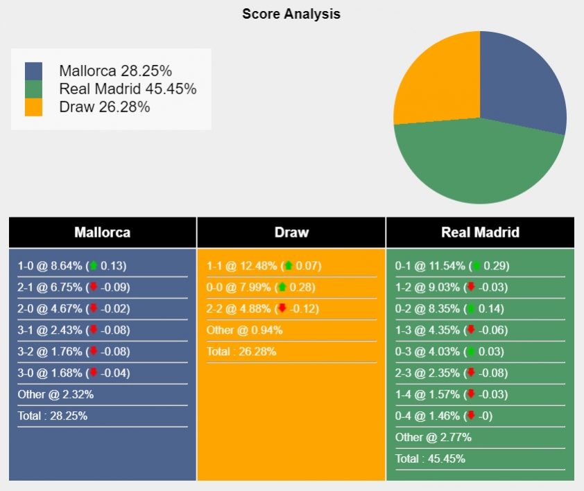 Tỷ số khả dĩ nhất cho chiến thắng của Real Madrid là 0-1 với xác suất là 11,54%. Tỷ số khả dĩ thứ hai cho kết quả đó là 1-2 (9,03%) và 0-2 (8,35%). Chiến thắng khả dĩ nhất của Mallorca là 1-0 (8,64%), trong khi tỷ số hòa là 1-1 (12,48%).