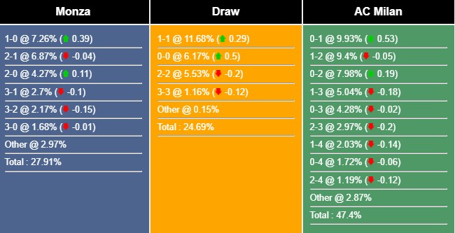 Với các tỷ số có khả năng xảy ra, việc Monza thắng lợi 2-1 đạt 6,91% . Khả năng 90 phút tới hai đội cầm hòa nhau 1-1 đạt 11,39% . Cuối cùng là việc AC Milan đánh bại Monza 2-1 là 9,44% .