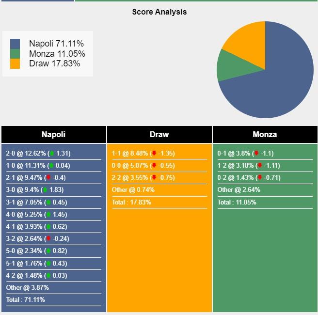 Với các tỷ số có khả năng xảy ra, câu lạc bộ Napoli thắng lợi 2-0 đạt 12,62%. Hai đội hoà nhau với tỷ số 1-1 đạt 8,48%.Monza sở hữu 3,8% khả năng đánh bại Napoli 1-0.