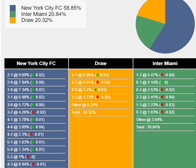 Tỷ số khả dĩ nhất cho chiến thắng của New York City FC là 2-1 với xác suất là 9,69%.Tỷ số khả dĩ thứ hai cho kết quả đó là 2-0 (7,94%) và 1-0 (7,34%). Chiến thắng khả dĩ nhất của Inter Miami là 1-2 (5,47%), trong khi tỷ số hòa là 1-1 (8,96%).