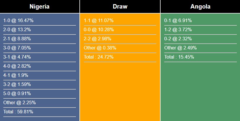 Với các tỷ số có khả năng xảy ra, việc Nigeria thắng lợi 1-0 đạt 16,47% còn chiến thắng 2-0 (13,2%) . Angola đánh bại Nigeria 1-0 là 6,91% trong 90 phút thi đấu tới đây. Tỷ lệ Nigeria và Angola hoà nhau 0-0 là 10,28%.