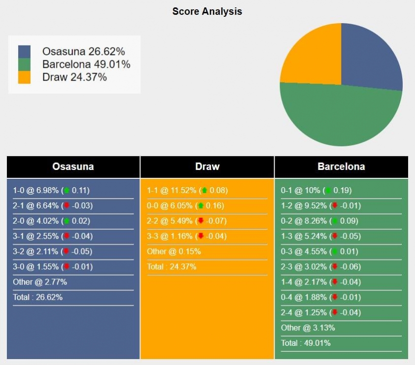 Tỷ số khả dĩ nhất cho chiến thắng của Barcelona là 0-1 với xác suất là 10%. Tỷ số khả dĩ thứ hai cho kết quả đó là 1-2 (9,52%) và 0-2 (8,26%).Chiến thắng khả dĩ nhất của Osasuna là 1-0 (6,98%), trong khi tỷ số hòa là 1-1 (11,52%).