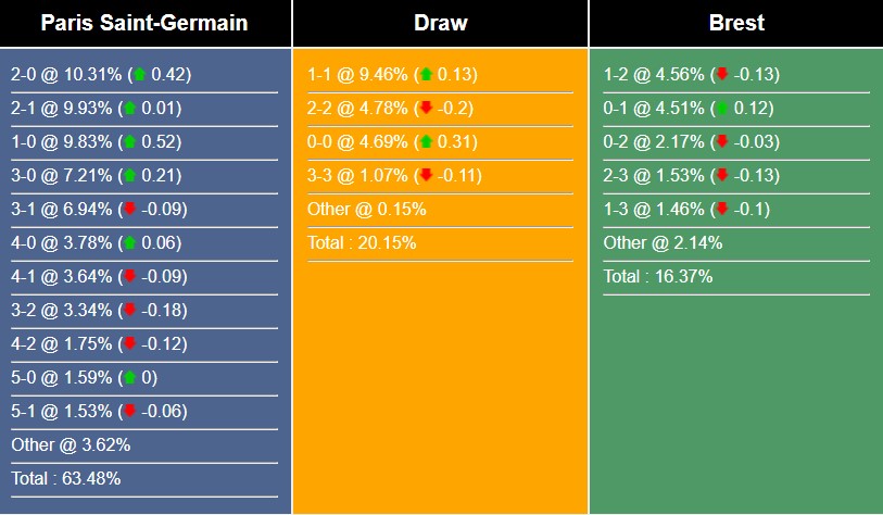 Tiếp đến là những kết quả có thể xảy ra ở cuộc đối đầu này. Khả năng câu lạc bộ PSG sẽ giành chiến thắng 2-0 đang được đánh giá cao nhất với 10.31% . Xếp ngay sau lại tiếp tục là dự đoán đội chủ nhà thắng 2-1 với 9.93% . Câu lạc bộ Brest chỉ có 1 kết quả được đánh giá khả năng là thắng 2-1 với tỷ lệ vỏn vẹn 4.56%. Còn xác suất 2 đội hòa nhau với tỷ số 1-1 là 9.46% .