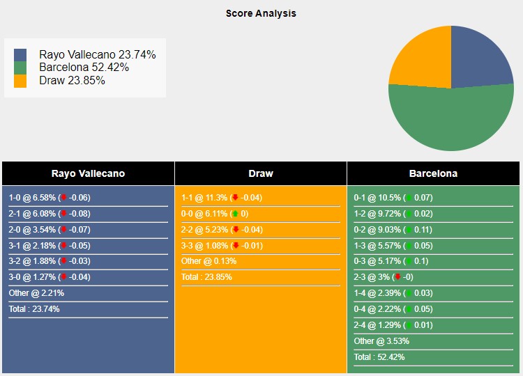 Với các tỷ số có khả năng xảy ra, câu lạc bộ Rayo Vallecano thắng lợi 1-0 đạt 6,58%.Hai đội hoà nhau với tỷ số 1-1 đạt 11,3%.Barcelona sở hữu 10,5% khả năng đánh bại Rayo Vallecano 1-0.