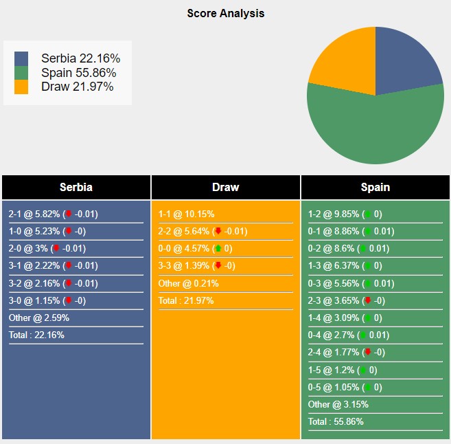 Với các tỷ số có khả năng xảy ra, câu lạc bộ Serbia thắng lợi 2-1 đạt 5,82%.Hai đội hoà nhau với tỷ số 1-1 đạt 10,15%.Tây Ban Nha sở hữu 9,85% khả năng đánh bại Serbia 2-1.