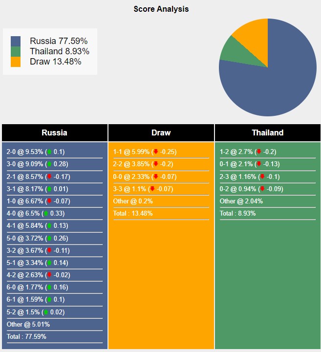 Với các tỷ số có khả năng xảy ra, câu lạc bộ Thái Lan thắng lợi 2-1 đạt 2,69%.Hai đội hoà nhau với tỷ số 1-1 đạt 5,99% Nga sở hữu 9,53% khả năng đánh bại Thái Lan 2-0.