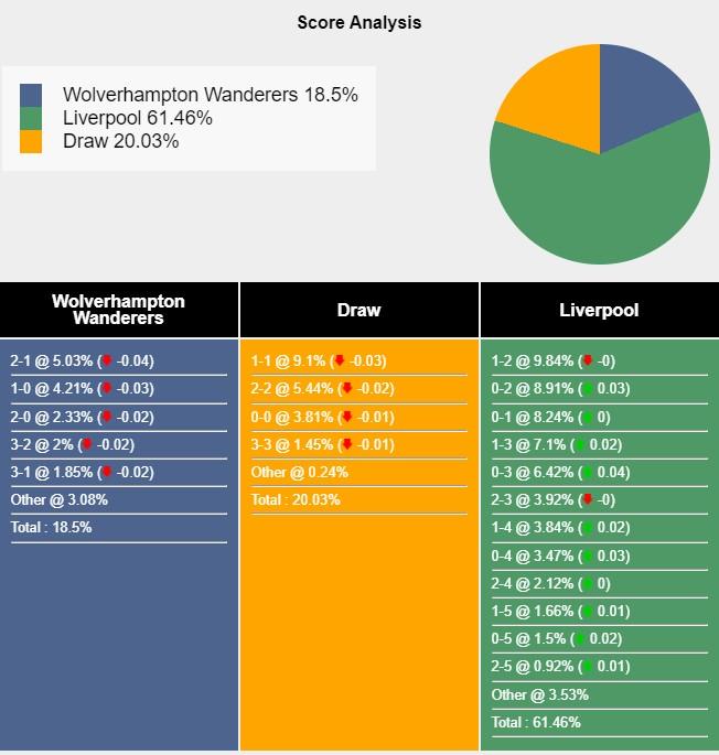 Với các tỷ số có khả năng xảy ra, câu lạc bộ Wolves thắng lợi 2-1 đạt 5,03%. Hai đội hoà nhau với tỷ số 1-1 đạt 9,1%. Liverpool sở hữu 9,84% khả năng đánh bại Wolves 2-1.