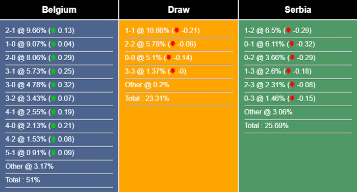 Tỉ số có khả năng nhất cho chiến thắng của Bỉ là 2-1 với xác suất là 9,66%. Các tỉ số có khả năng xảy ra tiếp theo cho kết quả đó là 1-0 (9,07%) và 2-0 (8,06). Tỉ số hòa dễ xảy ra nhất là 1-1 (10,86%), trong khi tỉ số nếu Serbia thắng là 1-2 (6,5%).