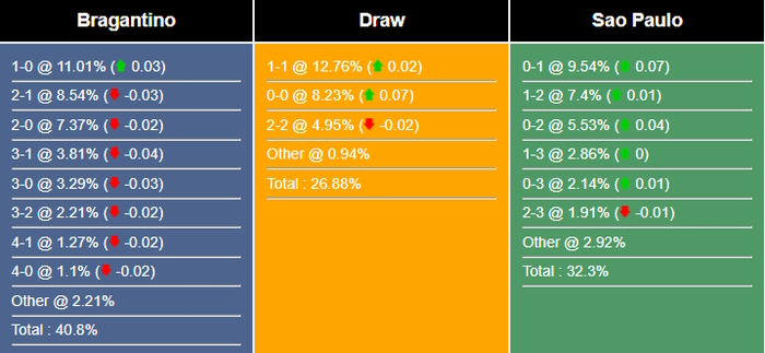 Tỉ số có khả năng nhất cho chiến thắng của Bragantino là 1-0 với xác suất là 11,01%. Các tỉ số có khả năng xảy ra tiếp theo cho kết quả đó là 2-1 (8,54%) và 2-0 (7,37%). Tỉ số hòa dễ xảy ra nhất là 1-1 (12,76%), trong khi tỉ số nếu Sao Paulo thắng là 0-1 (9,54%).