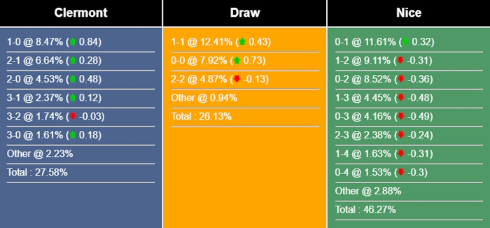 Tỉ số có khả năng nhất cho chiến thắng của Nice là 0-1 với xác suất là 11,61%. Các tỉ số có khả năng xảy ra tiếp theo cho kết quả đó là 1-2 (9,11%) và 0-2 (8,52) Tỉ số hòa dễ xảy ra nhất là 1-1 (12,41%), trong khi tỉ số nếu Clermont Foot thắng là 1-0 (8,47%).