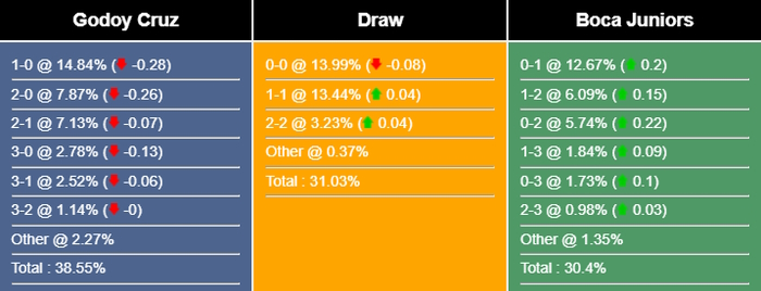 Tỉ số có khả năng nhất cho chiến thắng của Godoy Cruz là 1-0 với xác suất là 14,84%. Các tỉ số có khả năng xảy ra tiếp theo cho kết quả đó là 2-0 (7,87%) và 2-1 (7,13%). Tỉ số hòa dễ xảy ra nhất là 0-0 (13,99%), trong khi tỉ số nếu Boca Juniors thắng là 0-1 (12,67%).