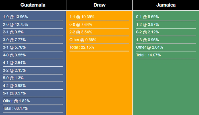 Tỉ số có khả năng nhất cho chiến thắng của Guatemala là 1-0 với xác suất là 13,96%. Các tỉ số có khả năng xảy ra tiếp theo cho kết quả đó là 2-0 (12,75%) và 2-1 (9,5%). Tỉ số hòa dễ xảy ra nhất là 1-1 (10,39%), trong khi tỉ số nếu Jamaica thắng là 0-1 (5,69%).