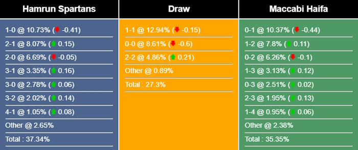 Tỉ số có khả năng nhất cho chiến thắng của Hamrun Spartans là 1-0 với xác suất là 10,73%. Các tỉ số có khả năng xảy ra tiếp theo cho kết quả đó là 2-1 (8,07%) và 2-0 (6,69%). Tỉ số hòa dễ xảy ra nhất là 1-1 (12,94%), trong khi tỉ số nếu Maccabi Haifa thắng là 0-1 (10,37%).