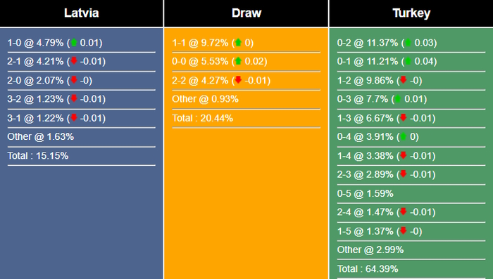 Tỉ số có khả năng nhất cho chiến thắng của Thổ Nhĩ Kỳ là 0-2 với xác suất là 11,37%. Các tỉ số có khả năng xảy ra tiếp theo cho kết quả đó là 0-1 (11,21%) và 1-2 (9,86%). Tỉ số hòa dễ xảy ra nhất là 1-1 (9,72%), trong khi tỉ số nếu Latvia thắng là 1-0 (4,79%).