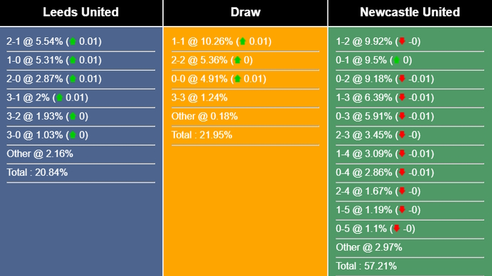 Tỷ số có khả năng nhất cho chiến thắng của Newcastle là 1-2 với xác suất là 9,92%. Các tỷ số có khả năng xảy ra tiếp theo cho kết quả đó là 0-1 (9,5%) và 0-2 (9,18%). Tỷ số hòa dễ xảy ra nhất là 1-1 (10,26%), trong khi tỷ số nếu Leeds thắng là 2-1 (5,54%).
