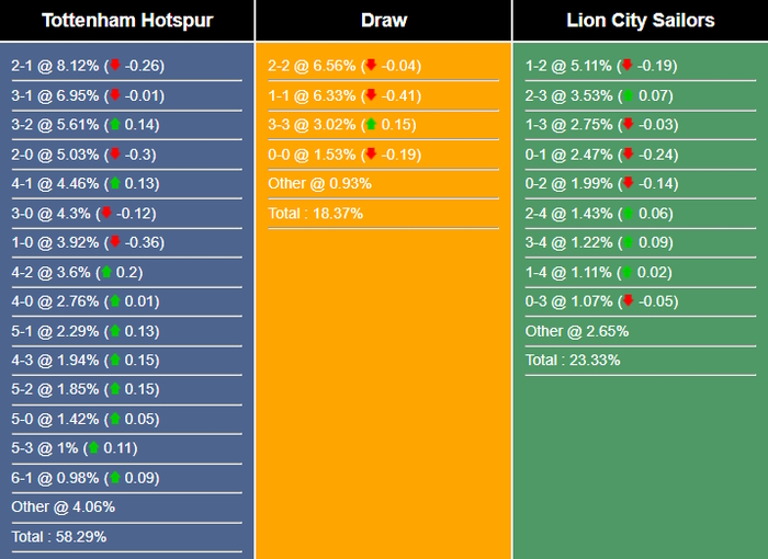 Tỉ số có khả năng nhất cho chiến thắng của Tottenham là 2-1 với xác suất là 8,12%. Các tỉ số có khả năng xảy ra tiếp theo cho kết quả đó là 3-1 (6,95%) và 3-2 (5,61%). Tỉ số hòa dễ xảy ra nhất là 2-2 (6,56%), trong khi tỉ số nếu Lion City Sailors thắng là 1-2 (5,11%).