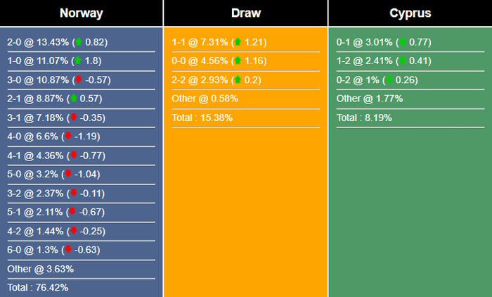 Tỉ số có khả năng nhất cho chiến thắng của Na Uy là 2-0 với xác suất là 13,43%. Các tỉ số có khả năng xảy ra tiếp theo cho kết quả đó là 1-0 (11.07%) và 3-0 (10,87%). Tỉ số hòa dễ xảy ra nhất là 1-1 (7,31%), trong khi tỉ số nếu Đảo Síp thắng là 0-1 (3,01%).