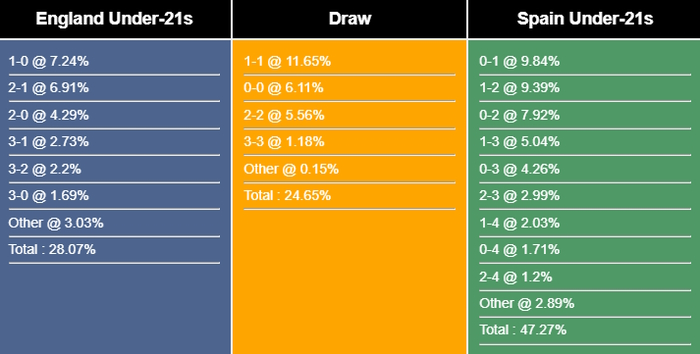Tỉ số có khả năng nhất cho chiến thắng của U21 Tây Ban Nha là 0-1 với xác suất là 9,84%. Các tỉ số có khả năng xảy ra tiếp theo cho kết quả đó là 1-2 (9,39%) và 0-2 (7,92%). Tỉ số hòa dễ xảy ra nhất là 1-1 (11,65%), trong khi tỉ số nếu U21 Anh thắng là 1-0 (7,24%).