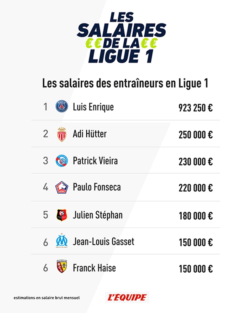 Theo truyền thông Pháp, HLV Luis Enrique của PSG là thuyền trưởng nhận lương cao nhất giải VĐQG Pháp. Thu nhập của ông cao hơn vài lần so với đồng nghiệp Adi Hutter (AS Monaco).