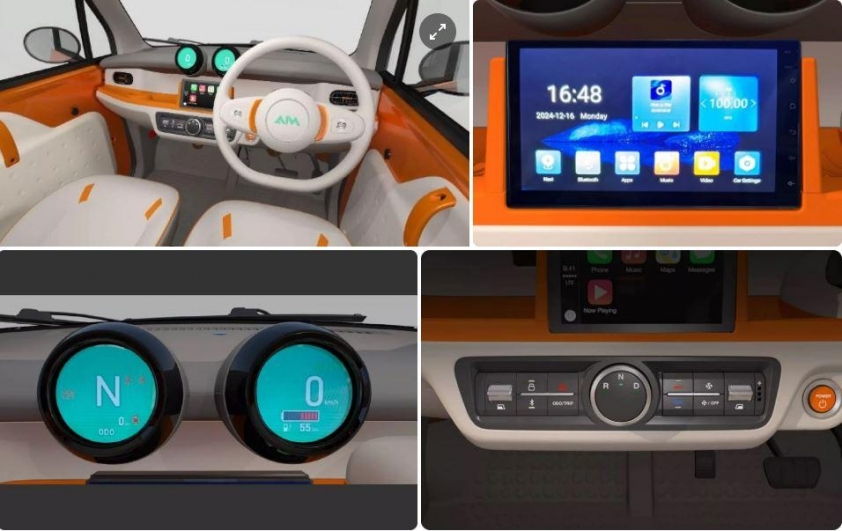 Khoang cabin của AIM EVM được thiết kế đơn giản nhưng không kém phần tiện nghi. Xe trang bị vô lăng hai chấu, màn hình giải trí trung tâm 7 inch cùng hai màn hình phụ dạng tròn hiển thị thông số vận hành.